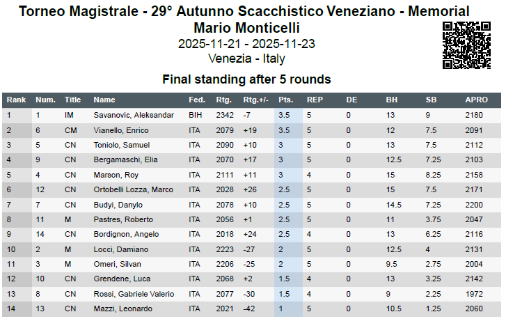 Naš član IM Aleksandar Savanović nastupio je na turniru u Veneciji i osvojio prvo mjesto. Tabela, rezultati i partije dostupni su na: