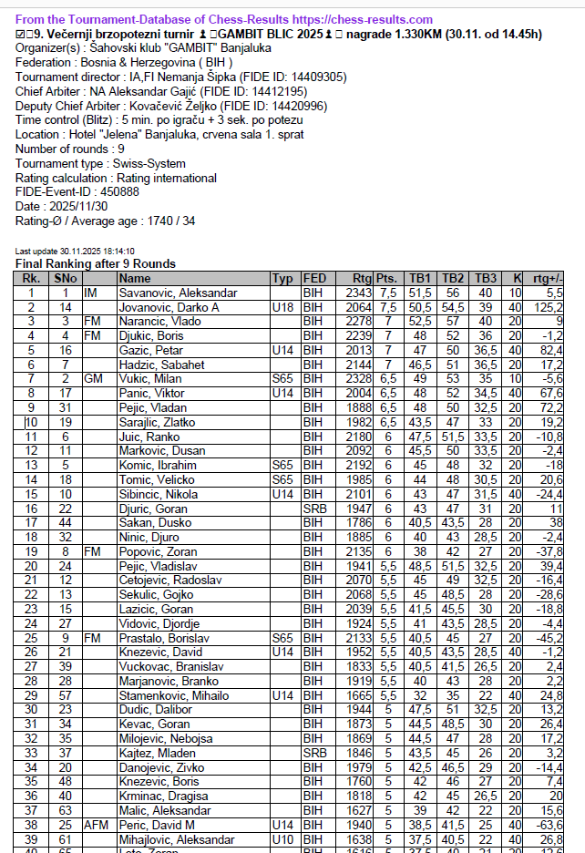 Naš član IM Aleksandar Savanović pobjedio je na 9. blitz turniru GAMBIT 2025. Tabela i rezultati dostupni su na: https://s1.chess-results.com/tnr1297057.aspx?lan=1&SNode=S0