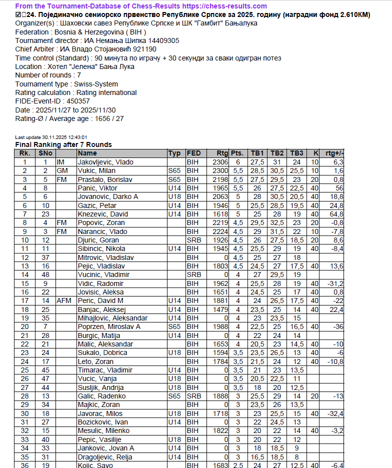 Naš član IM Vlado Jakovljević pobjedio je na 24. Prvenstvu Republike Srpske. Tabela, partije i rezultati dostupni su na: https://s3.chess-results.com/tnr1297407.aspx?lan=1&SNode=S0