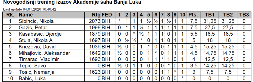 Na novogodišnjem trening turniru Akademije šaha prvo mjesto podijelili su Sibinčić Nikola i Petar Gazić, sa 7,5 poena iz 9 partija, ispred Đorđa Kasabašića sa 5,5 poena. Tabela i rezultati dostupni su na: https://s2.chess-results.com/tnr1328178.aspx?lan=1&SNode=S0