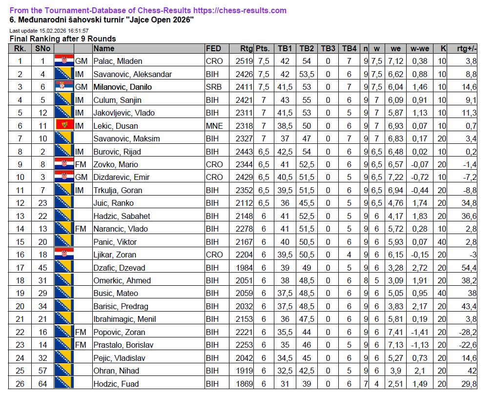 6. Međunarodni šahovski turnir “Jajce Open 2026”